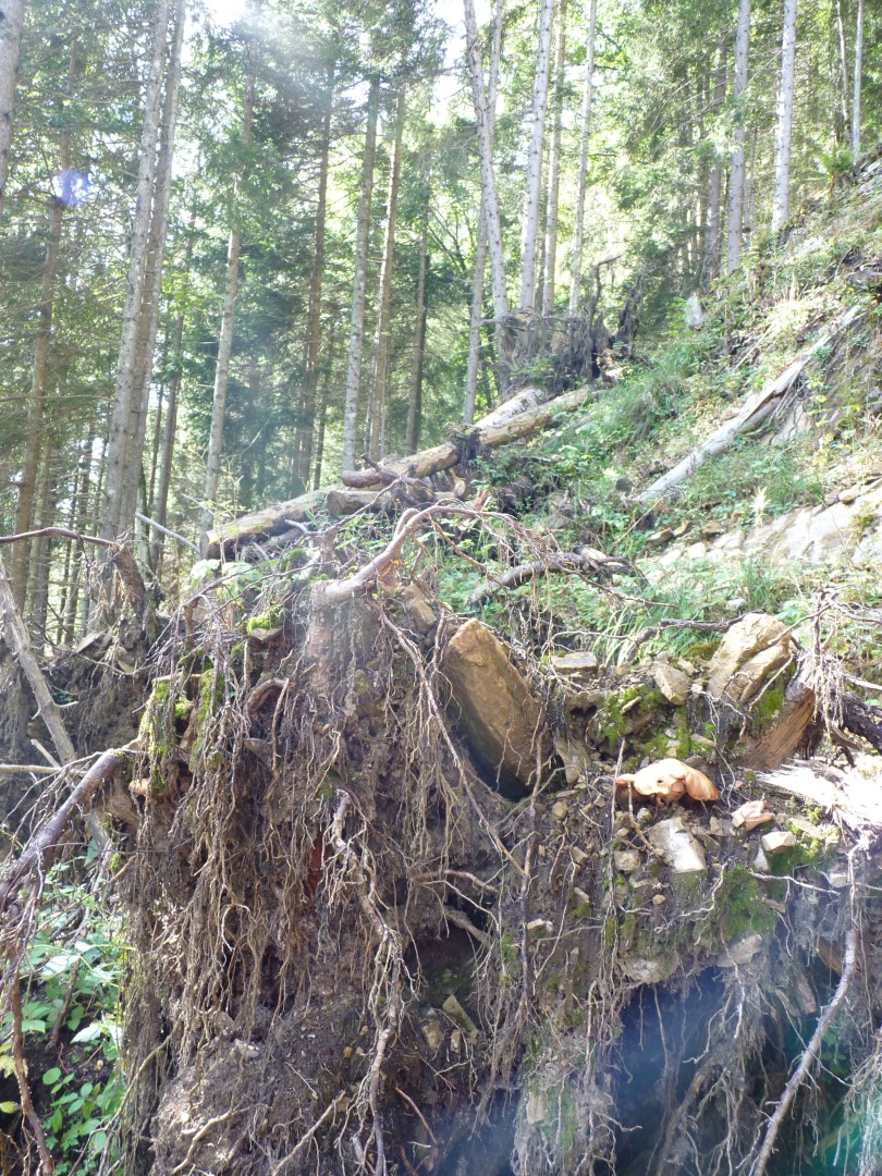 Die Stabilität der Bäume hat teilweise aufgrund der Stabilitätsdurchforstung im Jahr 2004 zugenommen (siehe Foto7). Dennoch findet vereinzelter Windwurf statt. Schneedruckschäden wurden keine gefunden. Die erhoffte Ansamung der Tanne konnte nur wenig festgestellt werden. Aufgrund der hohen Vegetationskonkurrenz in den Lücken hat es auch die Fichte schwer.
