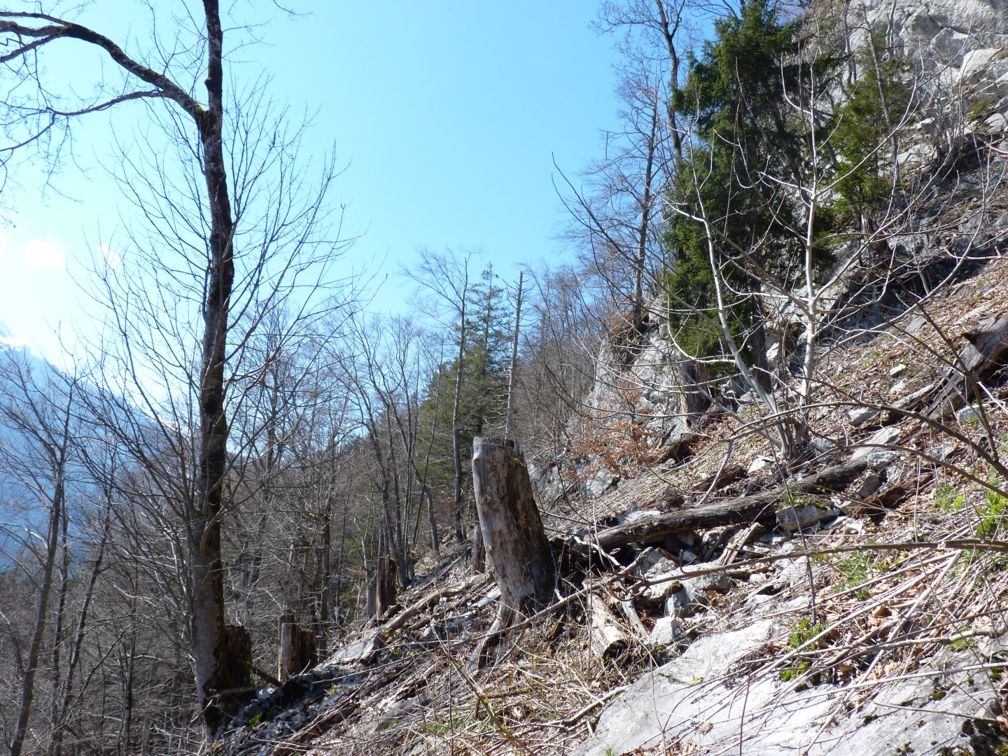 Dicke Querbäume erfüllen Funktion bezüglich Steinschlag noch, dünne bereits stark zerfallen Steinschlag hat keine negative Wirkung auf Verjüngung, fehlt eher wegen starkem Eingriff.