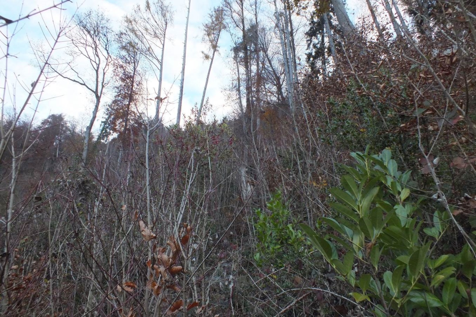 Aufwachsen eines artenreichen Jungwaldes. Einzelne Stellen von Brombeeren bedeckt und Waldreben auf Teilflächen ein grosses Problem. Schutzwirkung aufgrund geringer Stammzahl vorübergehend reduziert, was mit Querbäumen möglichst kompensiert wurde.