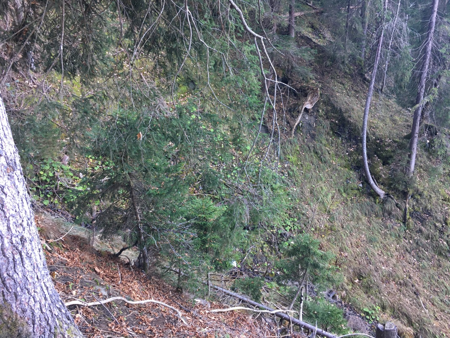 Der Wilddruck ist eher noch gestiegen, Tanne und weitestgehend auch Bergahorn haben keine Chance aufzukommen. Im Westen des Rutschkegels wo schwere Fichten entnommen wurden kommt die Verjüngung nur sehr langsam auf. Auch die Fichte wird stark durch Wildverbiss beeinträchtigt. Die lokalen Wuchsbedingungen sind schon ohne Wildverbiss extrem (Gefälle, Flachgründigkeit, Wasserablauf), der Verbiss scheint aber trotzdem ein stark hindernder Faktor zu sein. Das nahezu vollständige Fehlen des Bergahorn im Stangenholz ist überraschend.