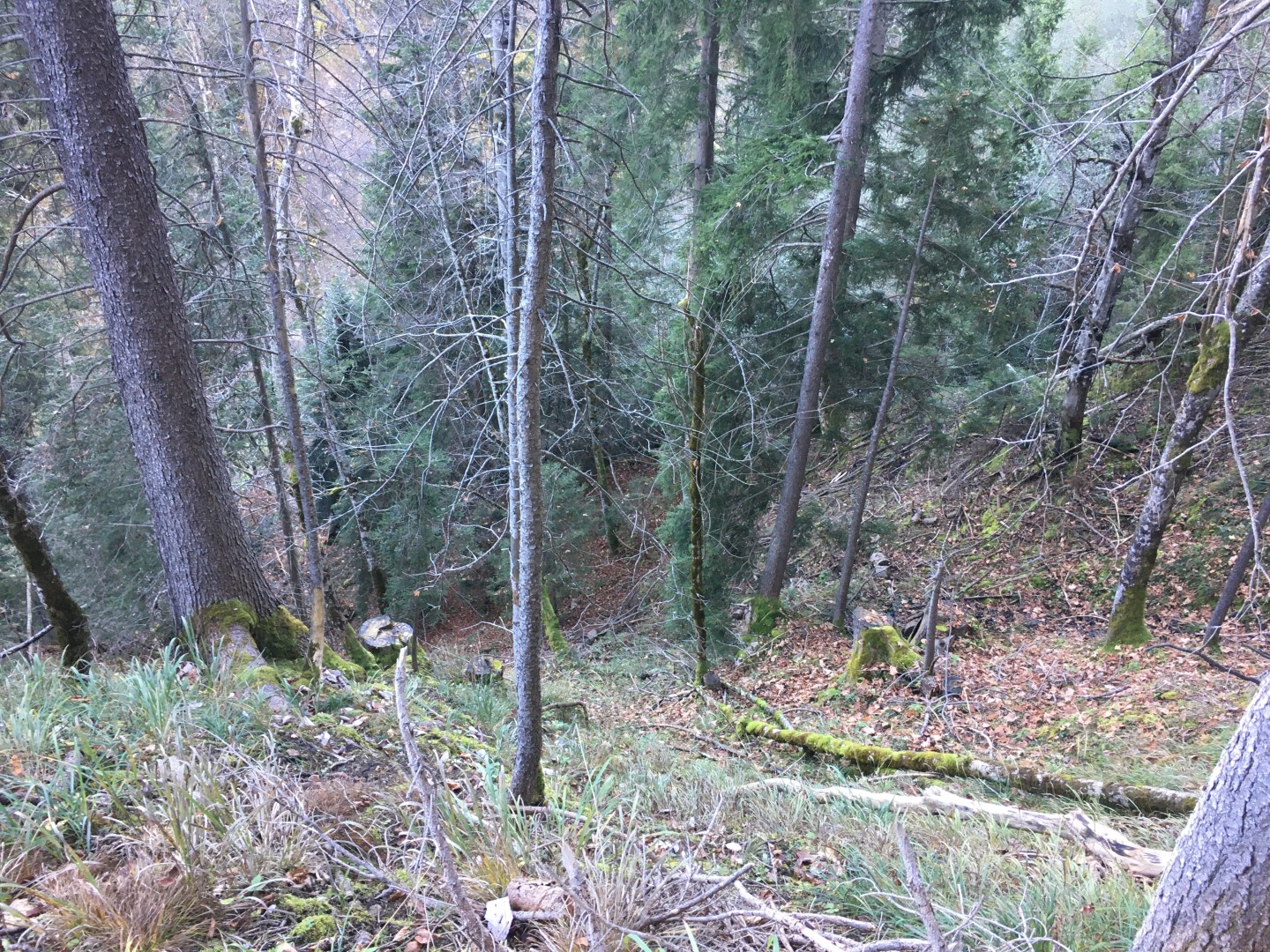 Die Bewaldung verhindert oder reduziert die flachgründigen Rutschungen. Die Stabilisierung des Hangs wiederum führt zu einem verstärkten Aufkommen der Verjüngung. Der Wildeinfluss auf die zukünftige Baumartenzusammensetzung ist gross. Die Tanne und der Bergahorn könnten hier bei niedrigerem Wilddruck gut aufkommen.
