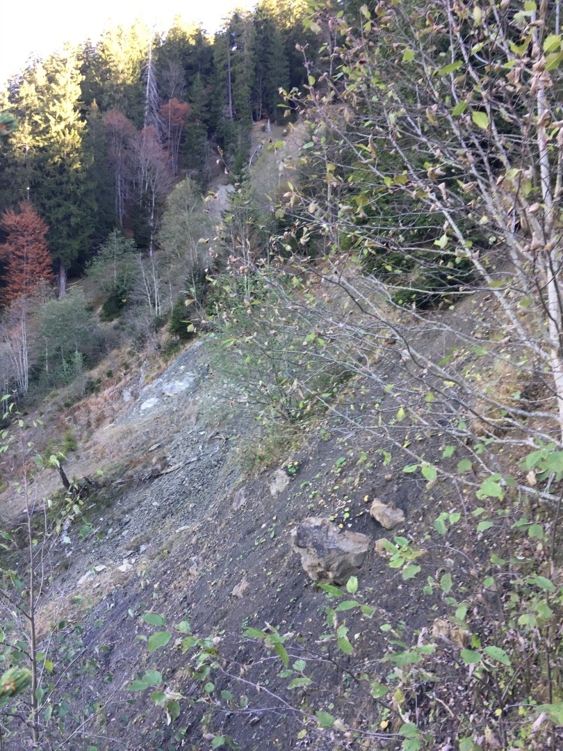 Dank dauernder Bestockung wurde Aktivität Rutschung verlangsamt und nicht erweitert. Keine schweren Bäume , sowie Struktur und Baumartenvielfalt mit dauernder Bestockung (idealer Schutzwald)