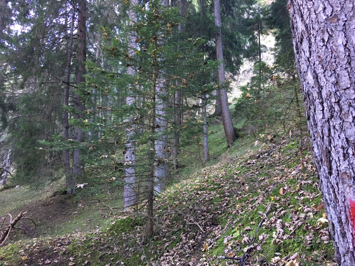 Die natürliche Wiederbewaldung von grösseren Rutschflächen funktioniert hier den Umständen entsprechend gut. Trotz der Bodenbewegung können Fichten und Weisserlen aufkommen und auch ins Baumholz wachsen (Fichte).