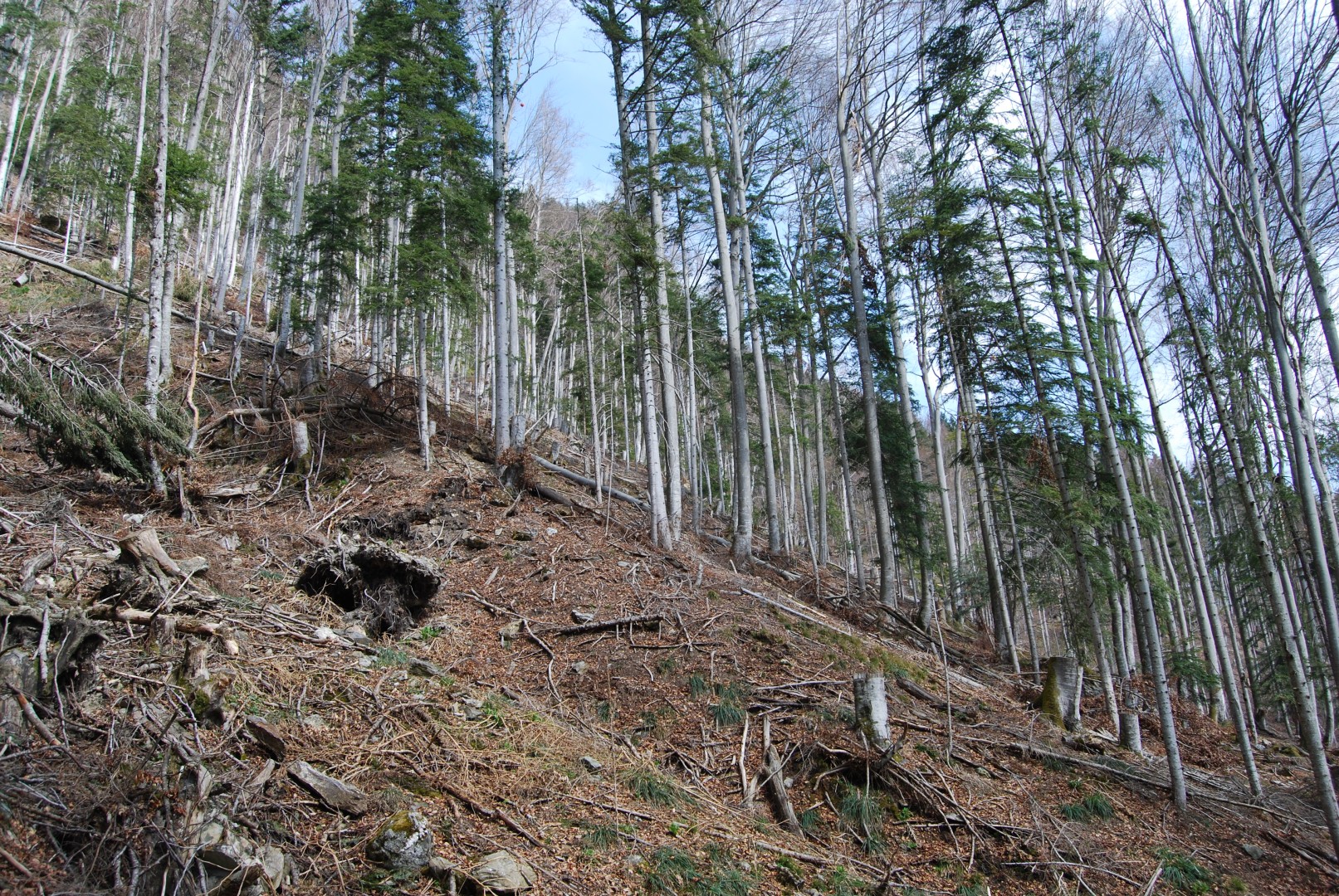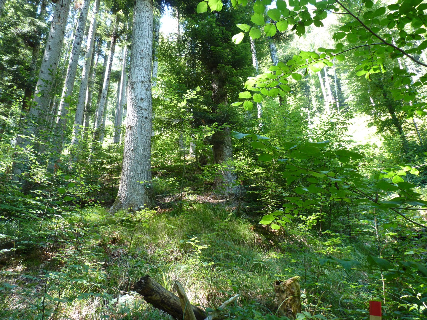 Einleitung der Verjüngung hat funktioniert. Trotz örtlicher Konkurrenz mit Brombeeren kommt genügend Verjüngung hoch. Es verjüngen sich mehrheitlich Buchen und im Rand Löcher Tannen und einzelne Fichten. Im Bezug auf den Klimawandel wäre eine erhöhte Baumartenpalette im Laubholz wünschenswert (Bergahorn). Aufbringen der Tanne mit aktuellen Wilddruck funktioniert gut (Flächen gemäss Wildschadengutachten grün).Was ist nicht gelungen? Gibt es unerwartete/überraschende Ergebnisse?