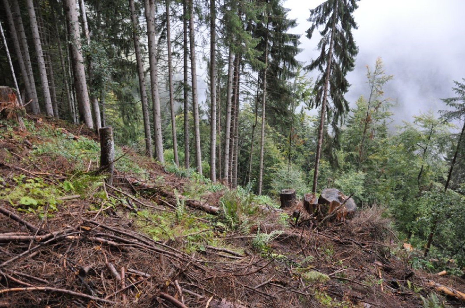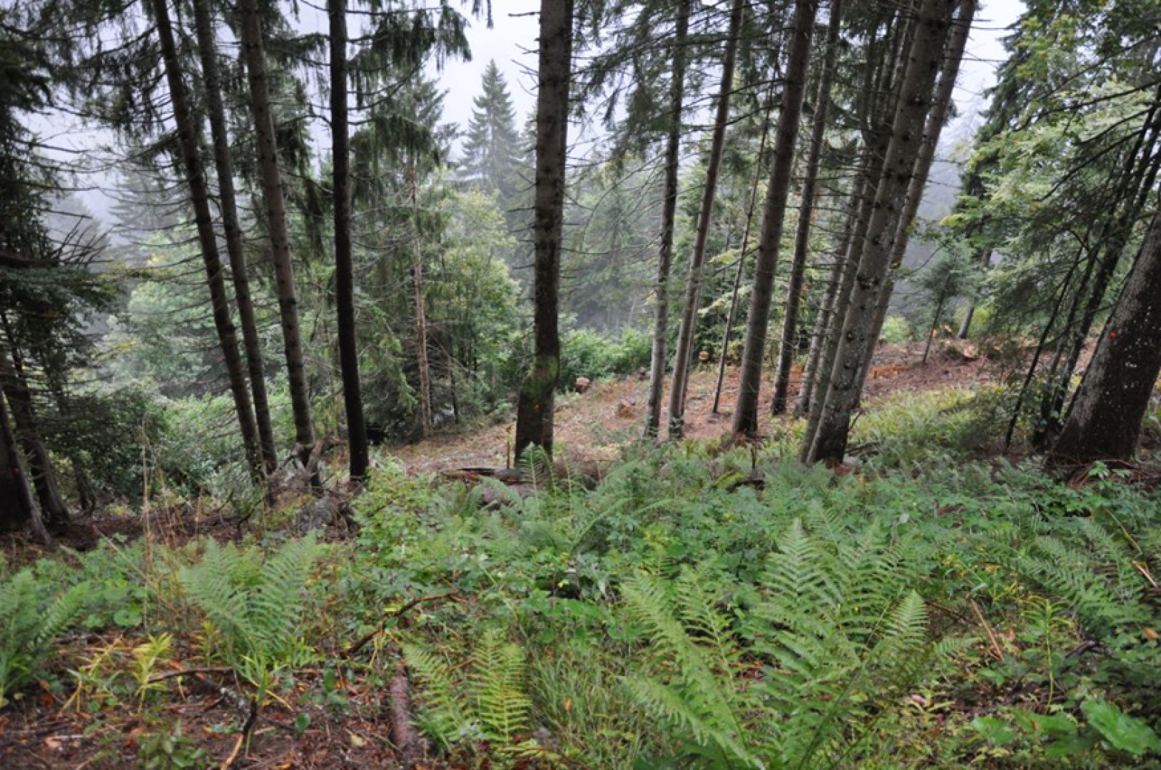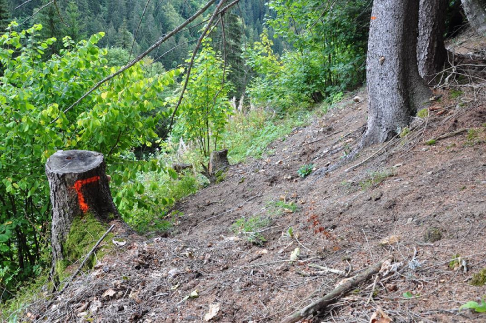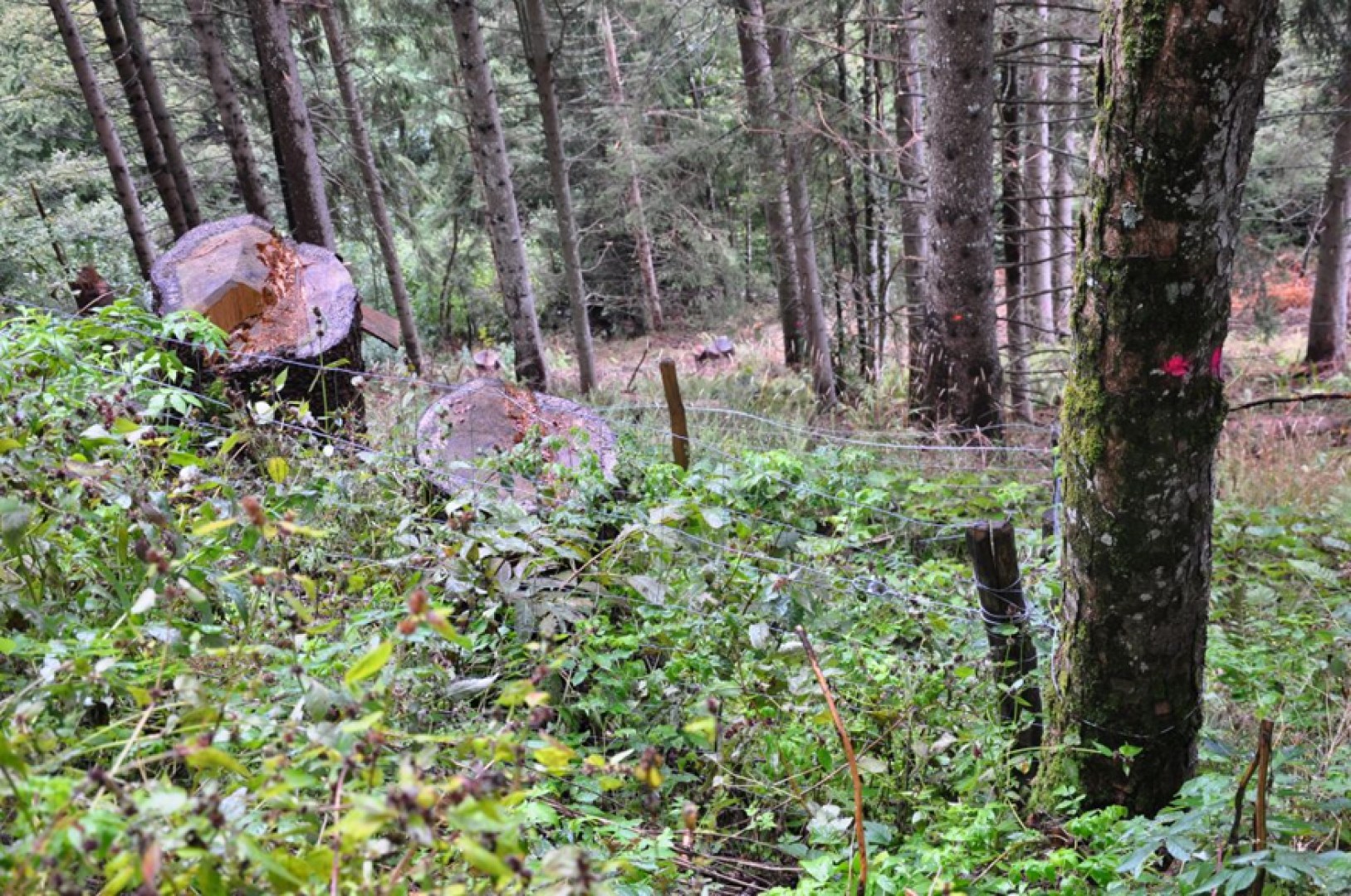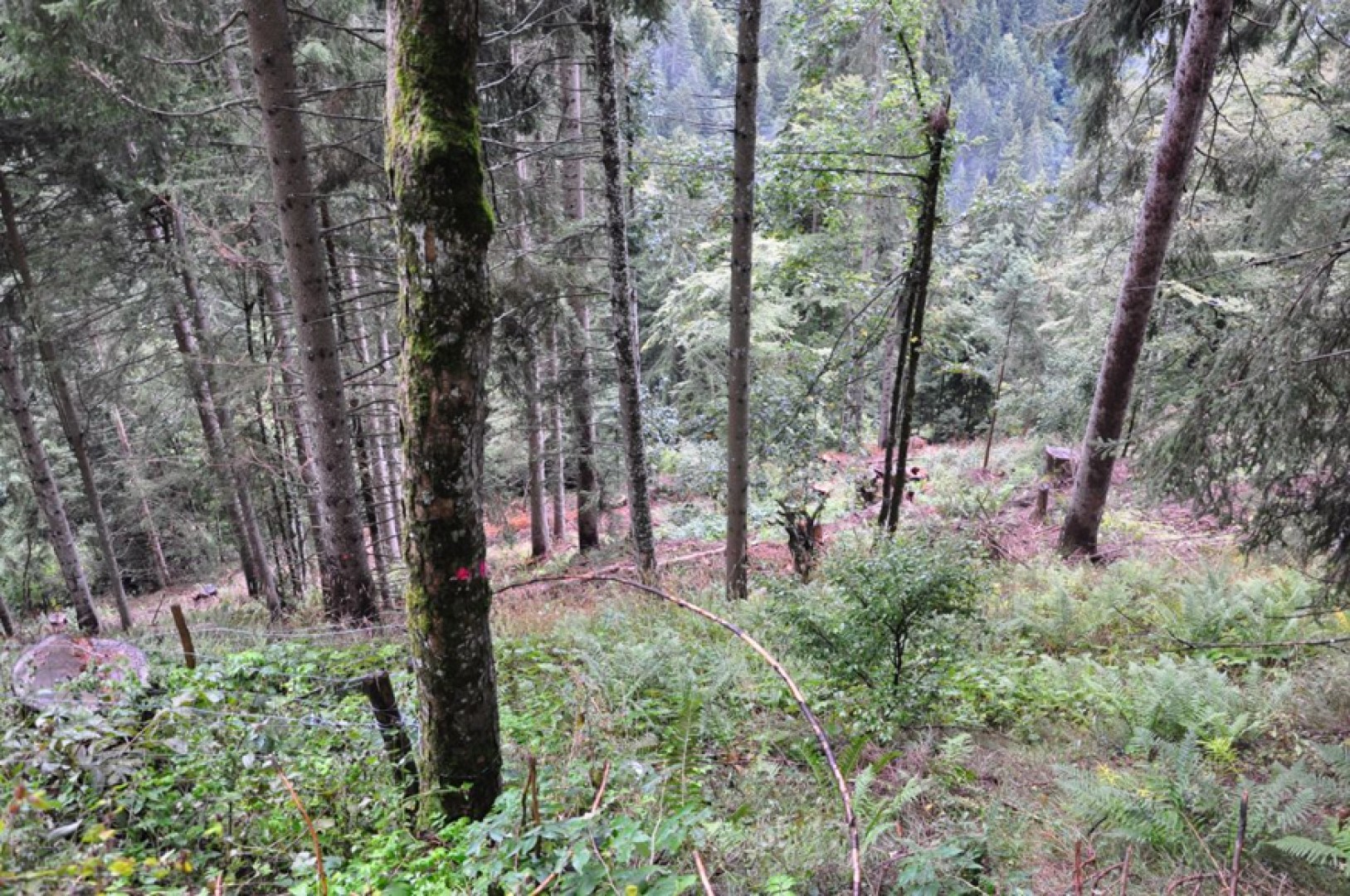 Coupe réalisée en 2013. Le volume de 2011 est passé de 701,01 sylves à 416.1 sylves en 2015 et le nombre de tiges de 623 à 363, le volume exploité est principalement constitué d'épicéas.