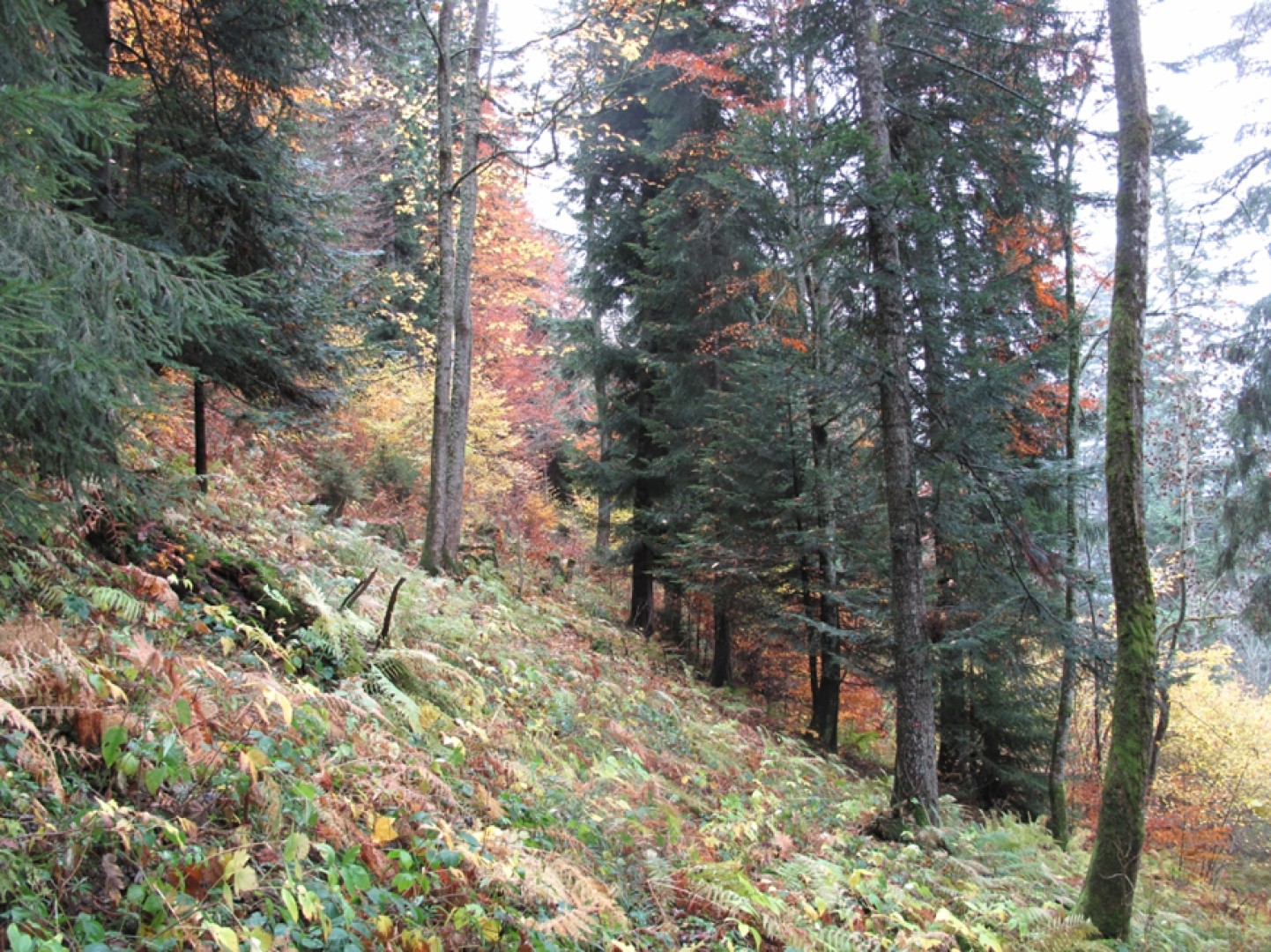 Concernant le mélange, résineux (sapin et épicéa) sont encore trop dominants, le hêtre devrait être plus présent. De plus, la diversité des feuillus devrait être plus grande pour permettre au peuplement d'être suffisamment résilient à l'avenir. Cela est très probablement dû à la pression du gibier qui empêche notamment l'érable et le sapin de se développer. Des essences adaptées au changement climatique sont présentes, mais la pression actuelle du gibier les empêchent de bien se développer. Néanmoins, on observe une meilleure stabilité du peuplement, car les arbres penchés et les gros instables ont été retirée durant les dernières exploitations. Cela a un effet positif sur la protection contre les phénomènes de glissements.