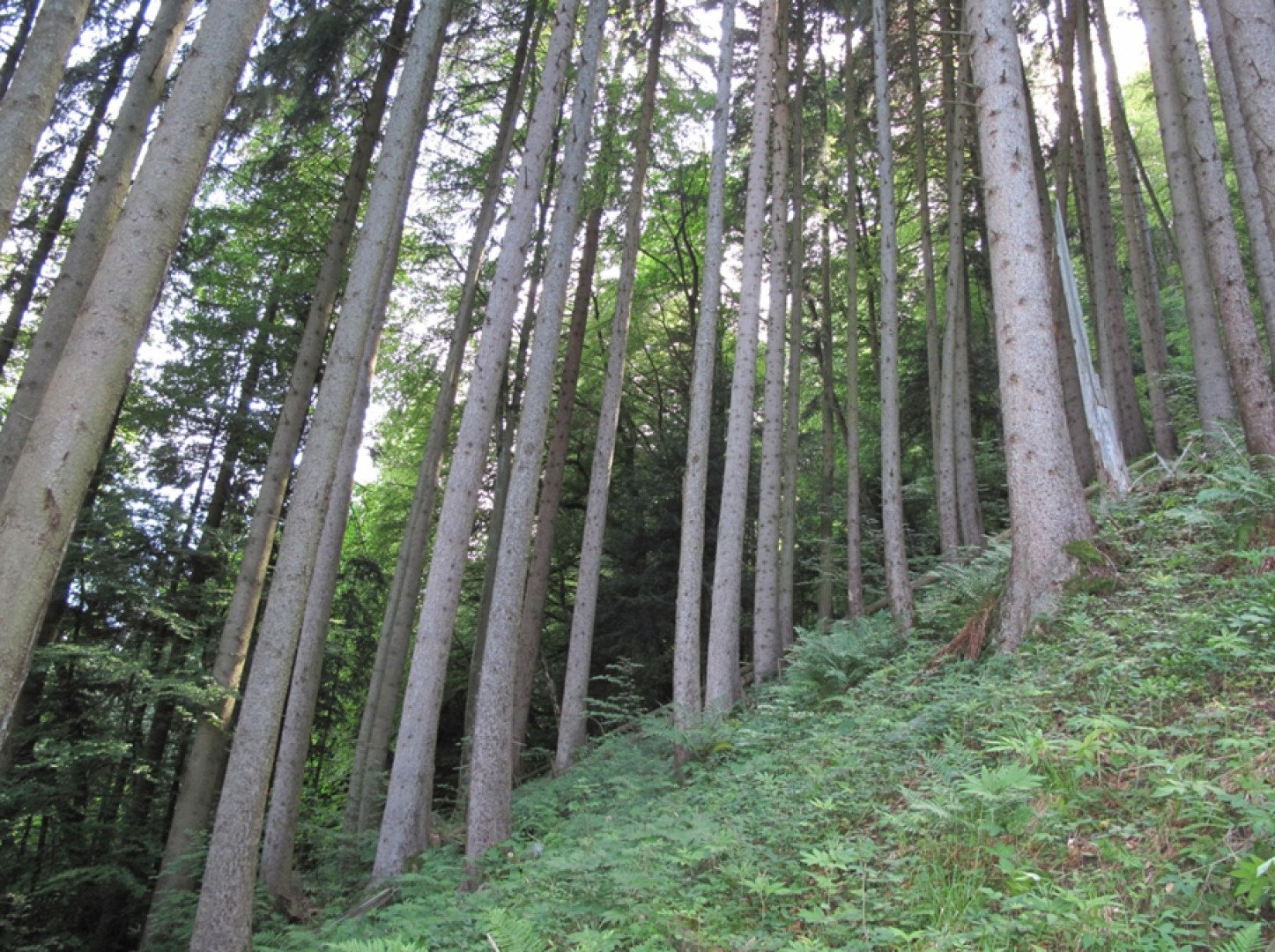 2011 : Installation de la placette. Futaie essentiellement résineuse avec une majorité d'épicéas et quelques feuillus. Signes d'instabilité au niveau de l'élancement des tiges. Résineux et feuillus penchés. Végétation herbacée au sol posant problème pour la venue du rajeunissement