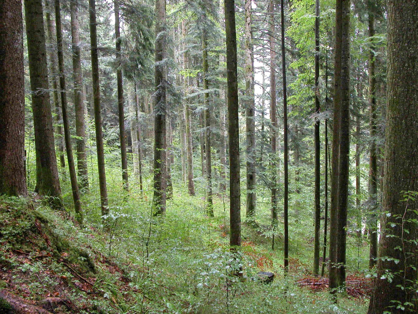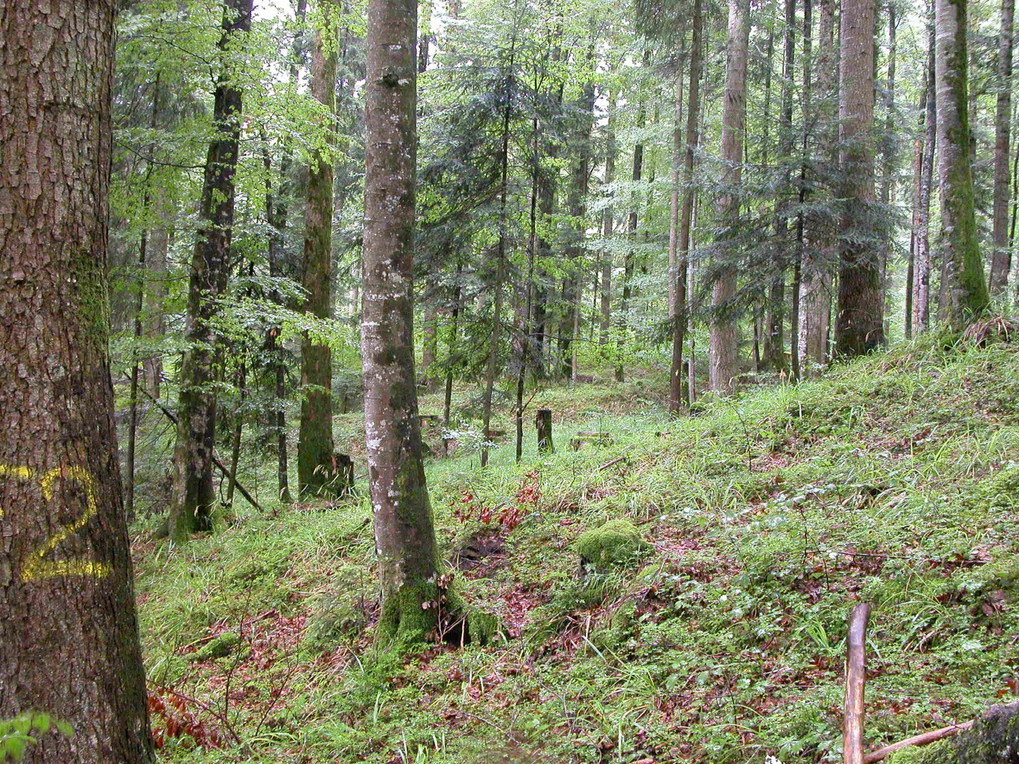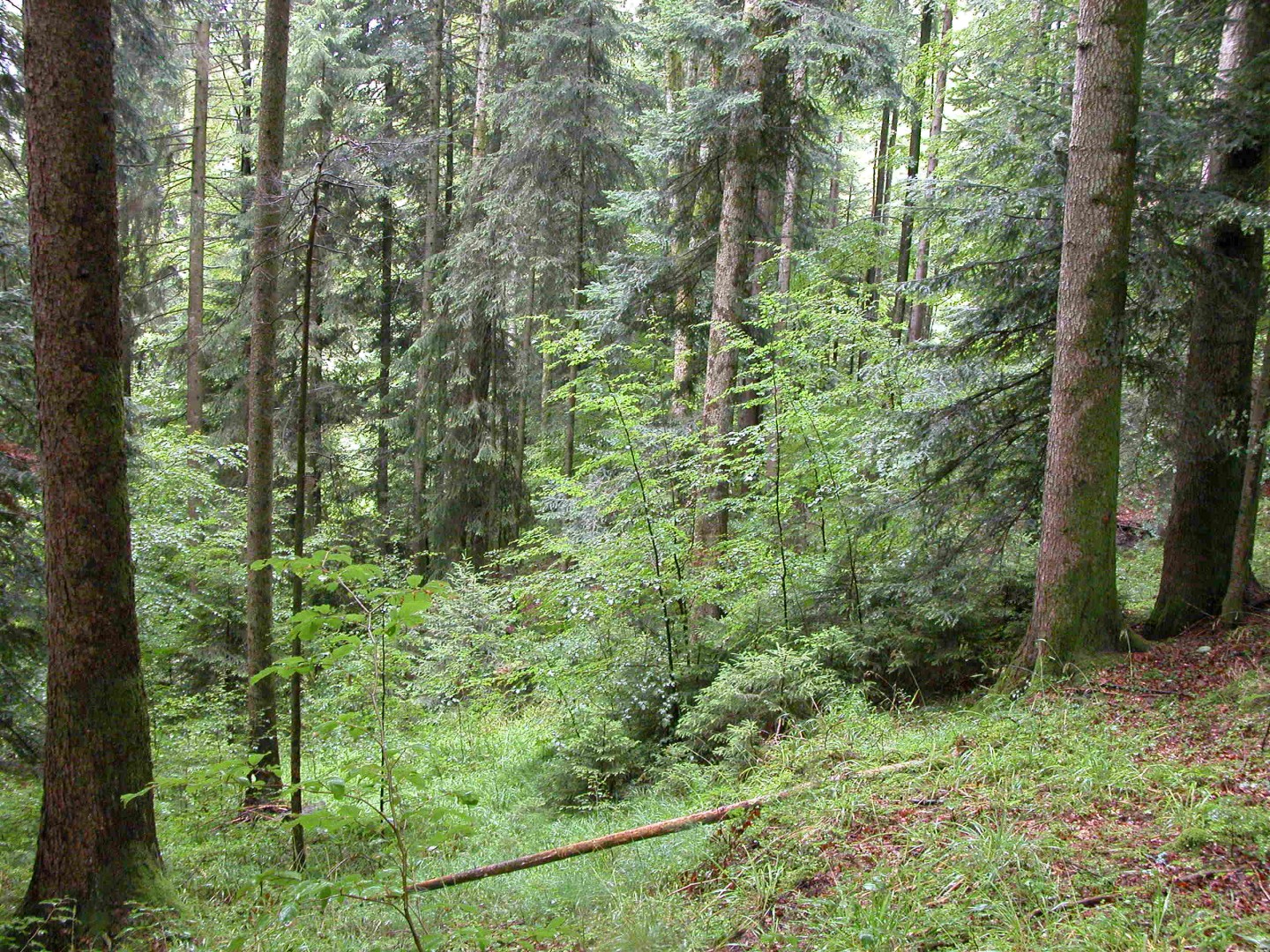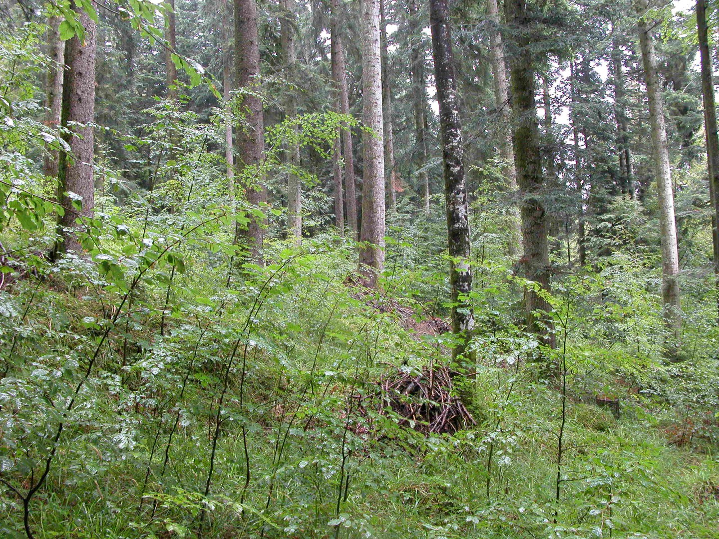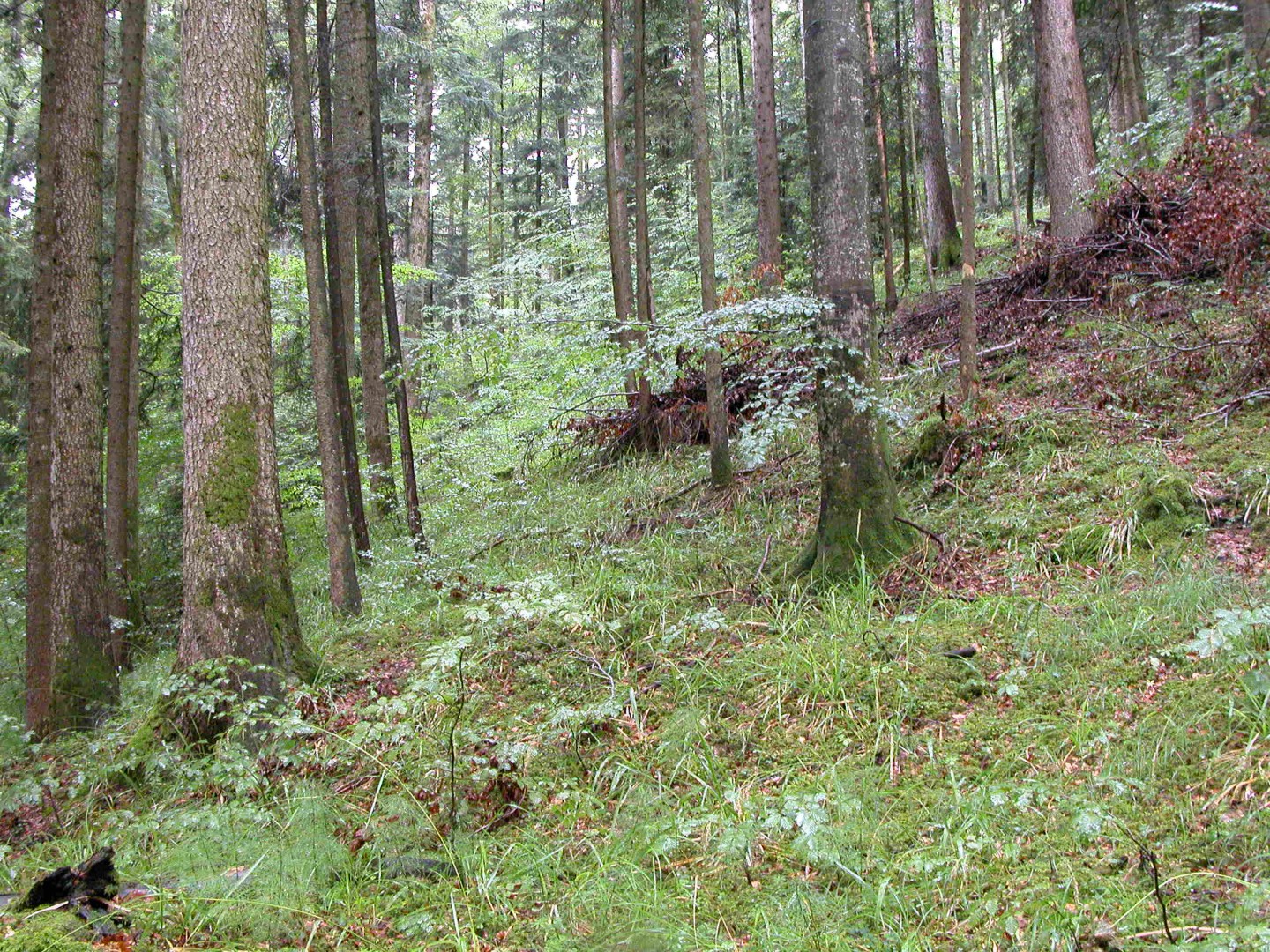 autochtoner Wald, ehemals im Kahl-Saumschlagverfahren bewirtschaftet, letzter Holzschlag ca. 1998.