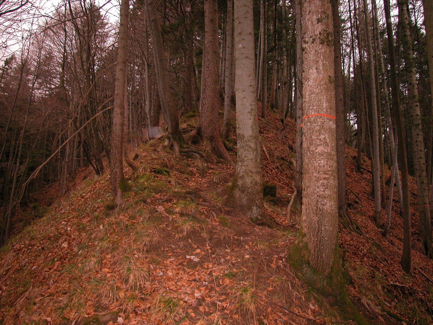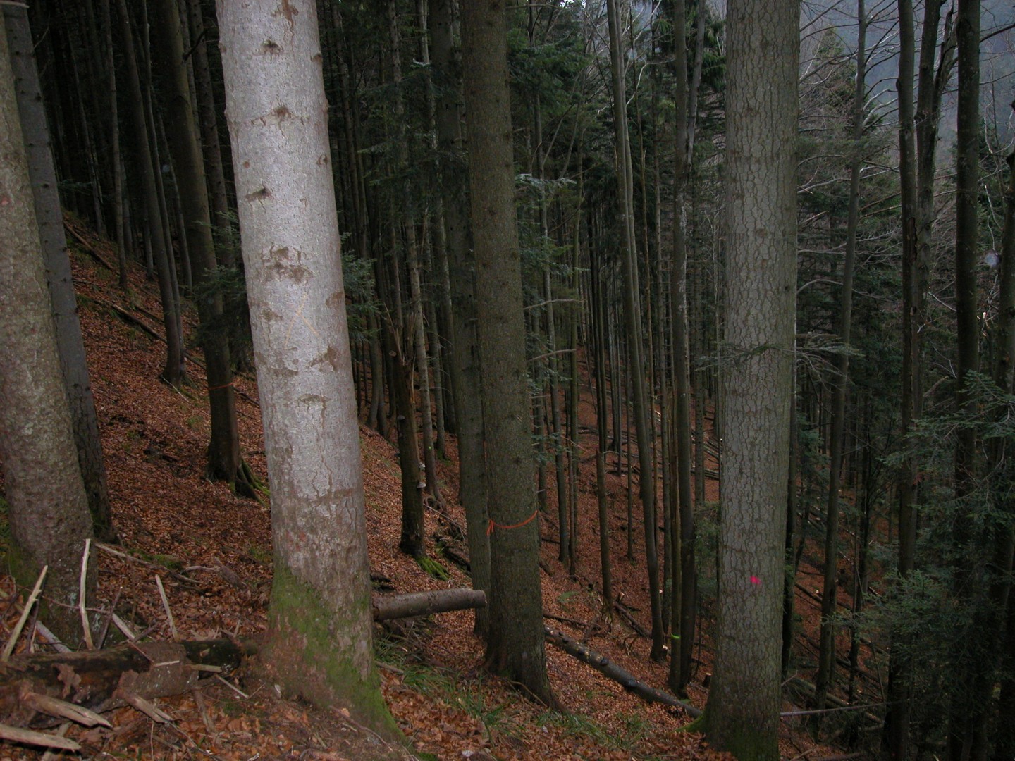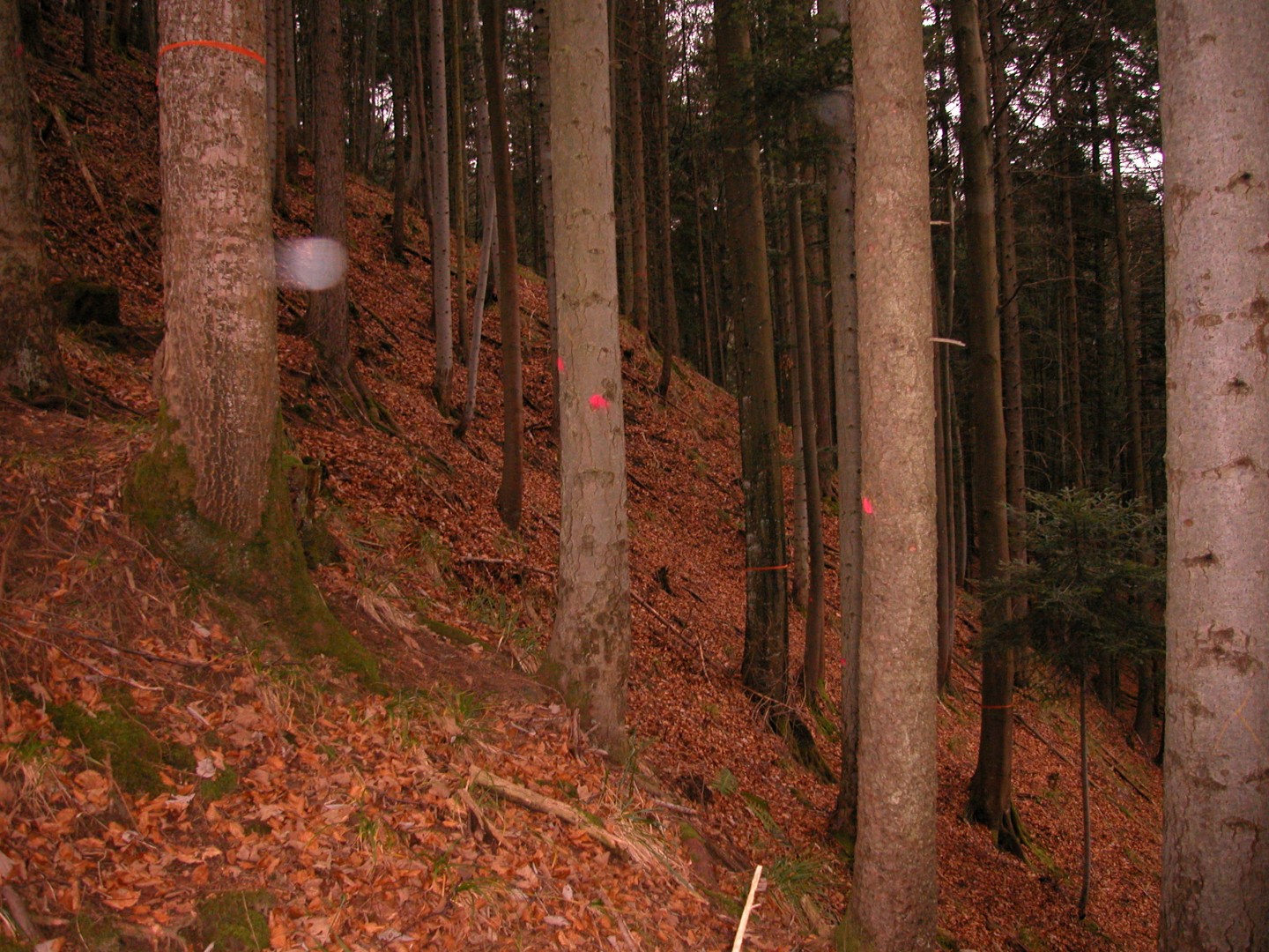 Bis im Jahr 2002 sind keine Eingriffe auf der Weiserfläche bekannt. Beim ersten Eingriff 2002 war der Wald durch schwere Bäume bewachsen und kein Licht kam zu Boden. Mithilfe von zwei Seillinien wurden rund 200m3 (Nur Weiserfläche) geschlagen und der Bestand verjüngt. In den nachfolgenden Jahren sind keine grösseren Störungen bekannt, Massnahmen wurden ebenfalls keine ausgeführt.
