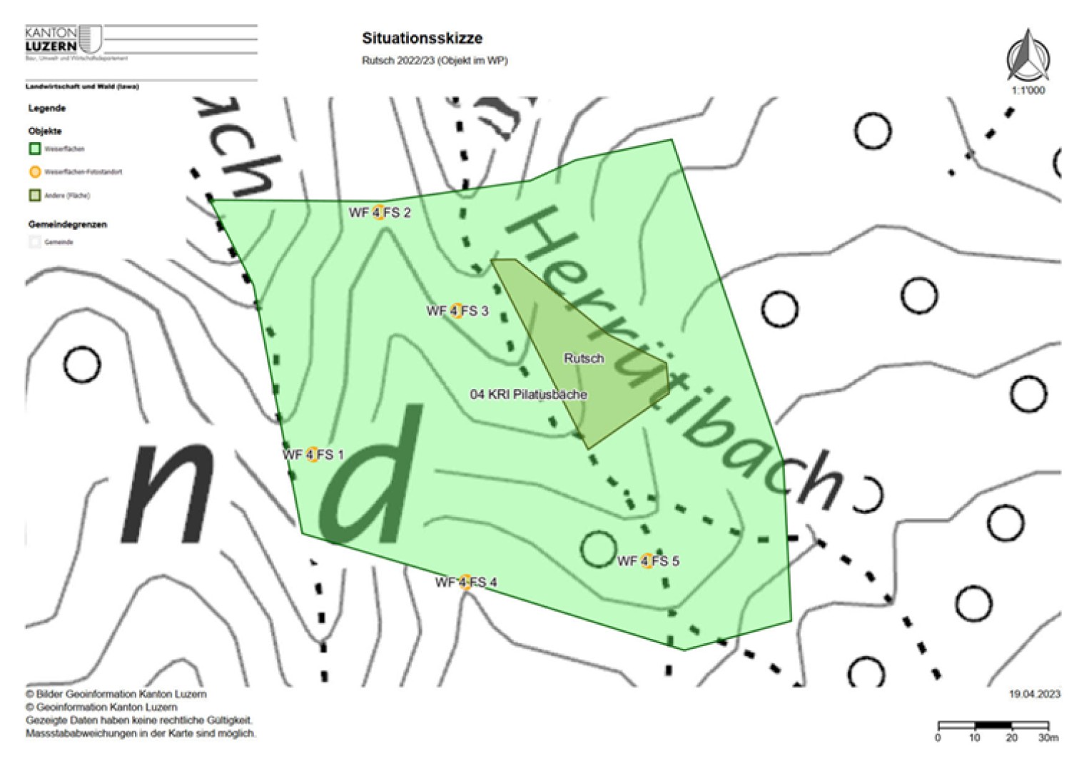 Um die Entwicklung dieser wichtigen Schutzwälder und die Wirkung der Massnahmen zu dokumentieren und daraus Erfahrungen für weitere Eingriffe im Gebiet zu sammeln, wurde im Bereich des Herrüti- und Brandhüslibach eine Weiserfläche eingerichtet. Gemäss der waldbaulichen Beurteilung gehört dieser Bestand zu den Wäldern mit 1. Priorität.