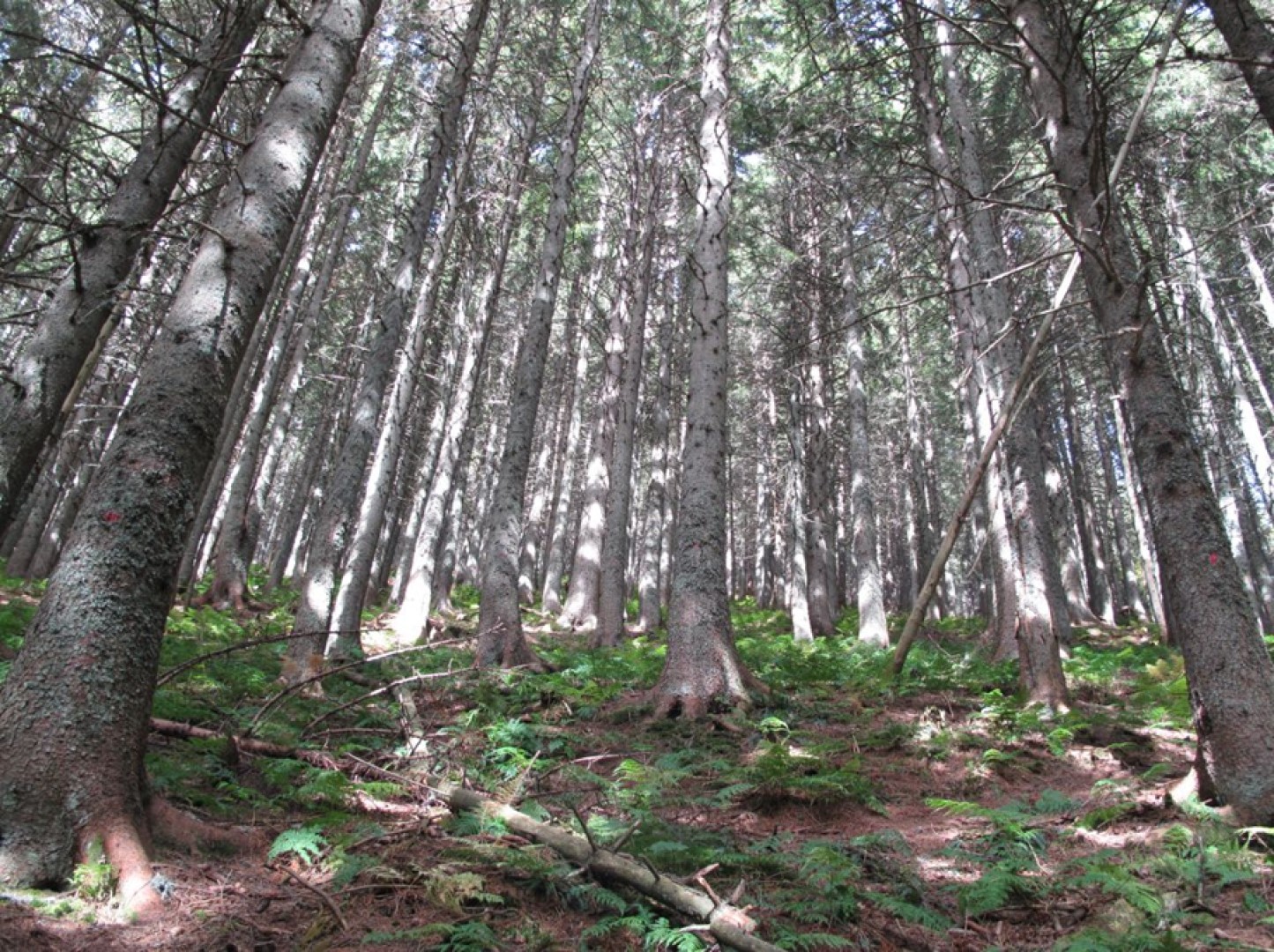 Majorité d'épicéas (95-100%), accompagné d'un peu d'érable (2-5%)