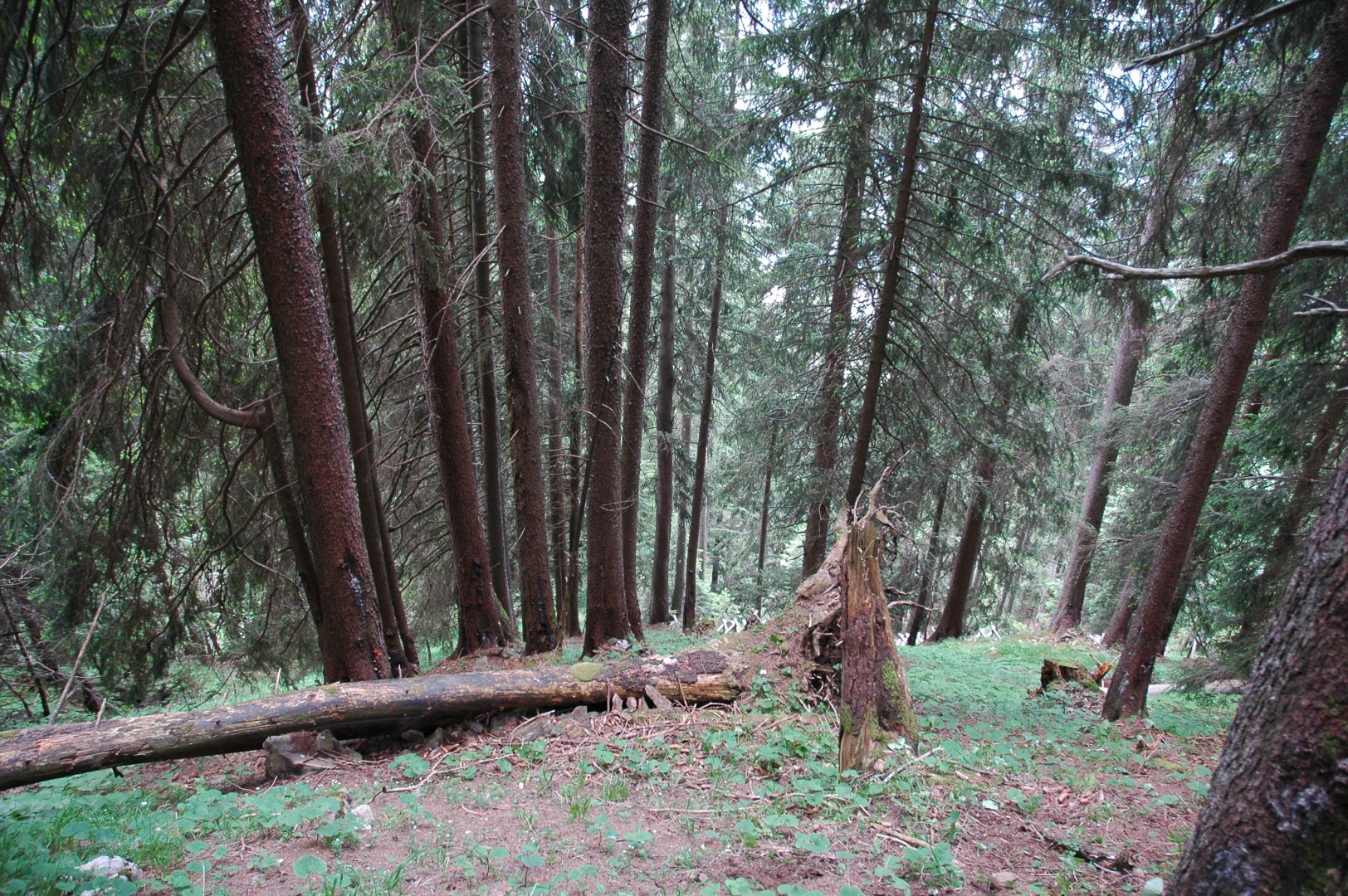 Verjüngung: Keine Ansamung feststellbar, Moderholz noch zu jung, Wildeinfluss an Weichhölzern deutlich sichtbar, Ansamung an verj. günstigen Stellen fehlt (Wild?), Was geschieht mit Pflanzen die aus Tok herauswachsen? Wildfrage schwierig zu beurteilen.