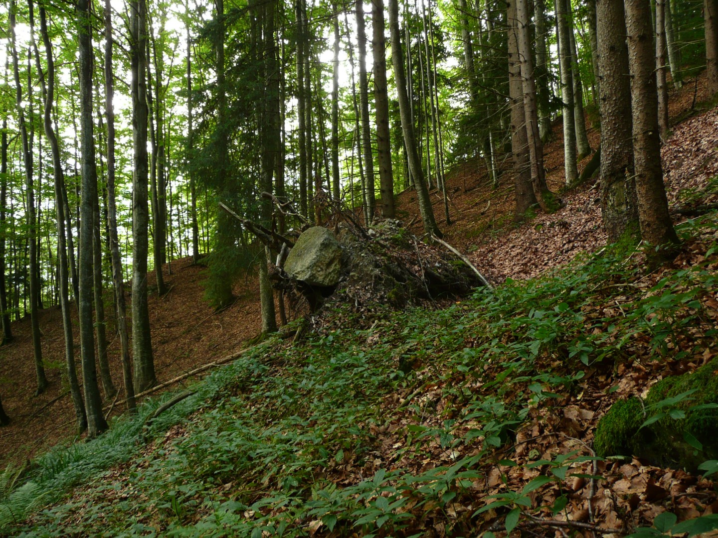 Im Hang Richtung E 3 (Exp. NO) sind 5 Bu (Total 2 m3) geworfen worden