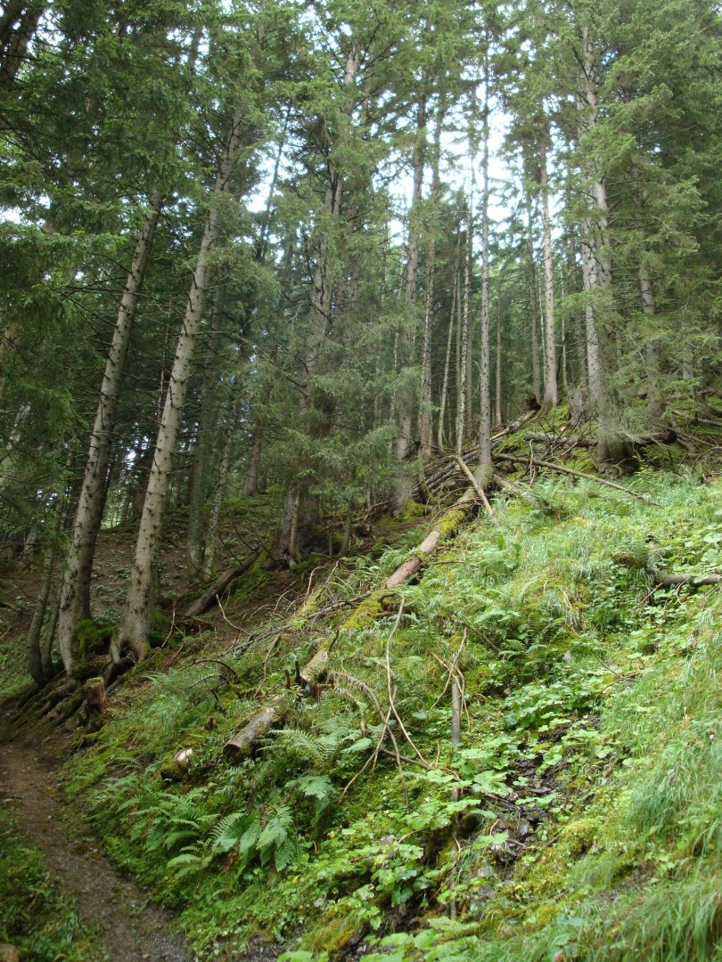 ca. 120 jähriger Bestand. Das ganze Gebiet ist mit Runsen (teilweise grossen Einhängen, Erosionsflächen) durchzogen. Gleichzeitig wird das Gebiet immer wieder durch Felsbänder senkrecht zur Falllinie durchschnitten. Auf den trockenen Kuppen findet man den Baumbestand, in den nassen Mulden Hochstauden. In der Vergangenheit keine Pflegeeingriffe. Stabilität des Bestandes mässig, schlechte h/d-Werte und kurze Kronen.