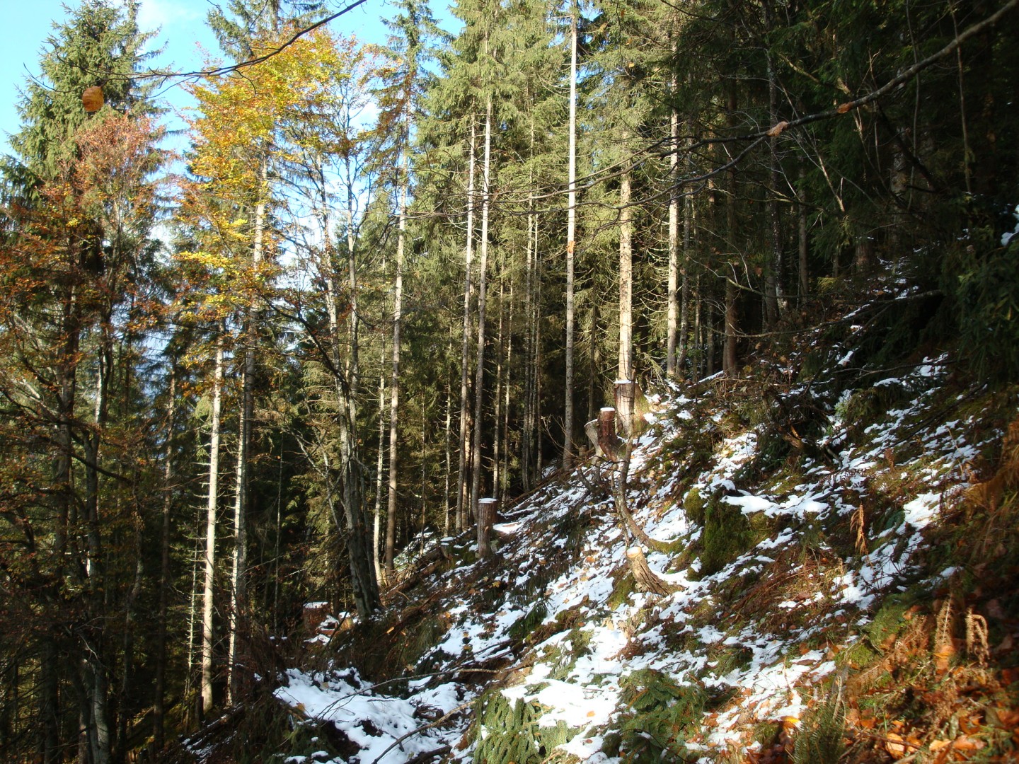 Ziel der Massnahme ist es die Verjüngung einzuleiten mit kleinen Öffnungen und gleichzeitig den stabilen Elementen im Bestand zu helfen (Stabilitätspflege).Die Grössen und Ausrichtungen der Öffnungen sind sehr unterschiedlich (siehe Karte). Die neu entstandenen Kronenränder haben meist kurze Kronen und müssen wegen Käferbefall beobachtet werden. Auf den Rippen sollte die Konkurrenz der Hochstauden nicht so gross sein, so dass sich die Fichte verjüngen kann. Tannenverjüngung ist wegen der hohen Wilddichte nicht möglich. Wegen der fehlenden Eingriffe in der Vergangenheit fehlt die Verjüngung. Beim Eingriff wurden 244 m3 Holz auf einer Fläche von 1.5ha genutzt. dies ergibt eine Eingriffsstärke von 162m3/ha. Im Vergleich zu einem Dauerwaldeingriff ist das etwa das Doppelte (Zuwachs: ca 5m3/ha/Jahr, Turnus 10 Jahre, Vorratsabbau pro Eingriff 30m3/ha ==> Eingriffsstärke von 80 m3/ha). Das meiste Holz wurde ausgeflogen, da das Gebiet mit Runsen durchzogen ist (Holz in Runsen), bereits ein hoher Anteil an Totholz vorhanden ist und die Variante Ausfliegen billiger ist als die Variante Entrinden im Bestand.