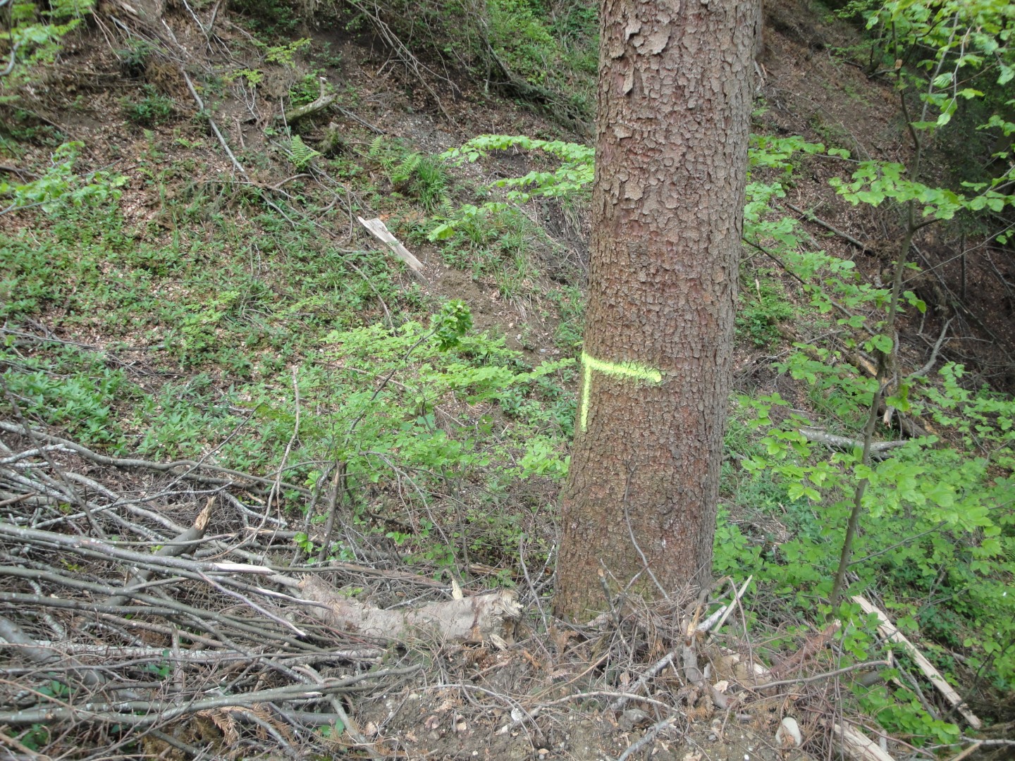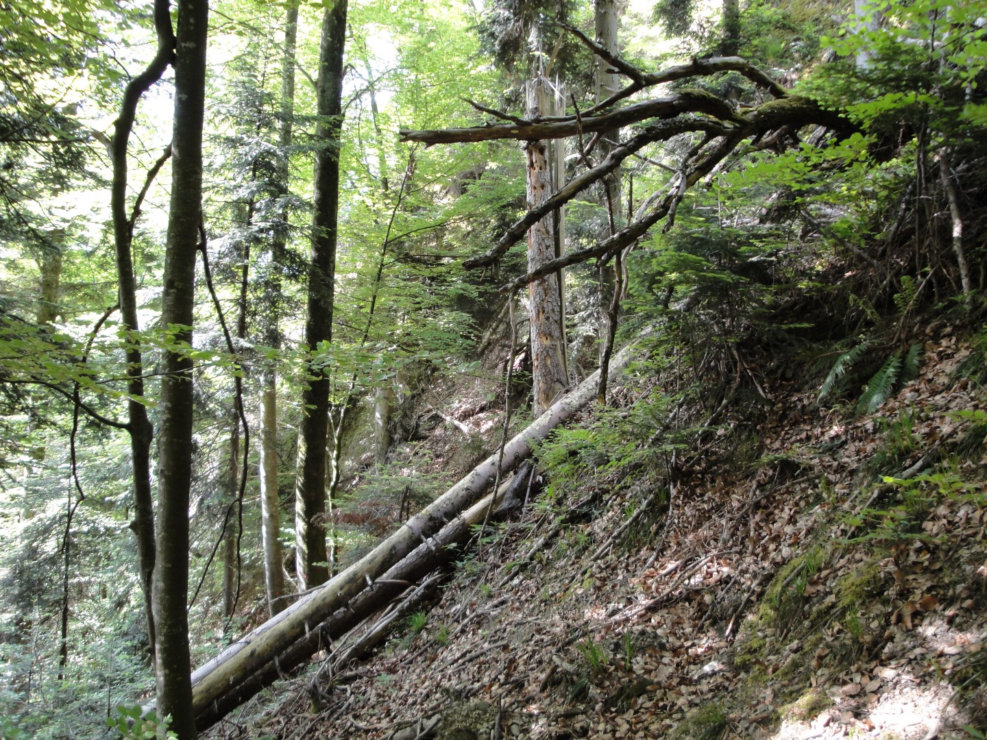 Auf unterer Weisergrenze 4 Bäume gefällt --> sollte vorhandene Verjüngung positiv begünstigen. Für diesen Typ Steinschlag erfüllt die vorhandene Verjüngung vollständig die Schutzfunktion. Die quergelegten Buchen ab Durchmesser 35cm würden nach wie vor die Schutzfunktionen erfüllen. Die schwächeren Durchmesser würden dies nur noch teilweise.