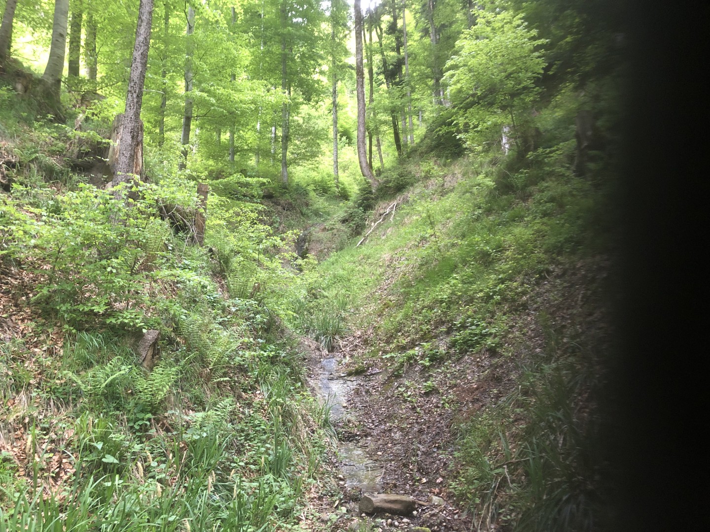 Der Hirsch hat einzug gehalten starke Schäden am Jungwuchs, Es 70%, Ah 30%, Ta 10%, Bu 5%, Fi 0%, unsichere Entwicklung betreffend (Es, Ah). An den älteren Eschen zum Teil Eschenwelke festgestellt. Der Kronenraum in der Oberschicht schliesst sich schnell, so dass sich für die weitere Entwicklung des Jungwuchses ein kleiner Eingriff in Betracht ziehen muss (2-4 Jahre). Buche auf diesem Standort konkurrenzsstärkste Baumart. Weiter entwickeln der Ansamung, auf alter, betreffend Licht, Wildschaden, Baumartenmischung, besonderes Augenmerk auf Bergahorn wenig vorhanden.