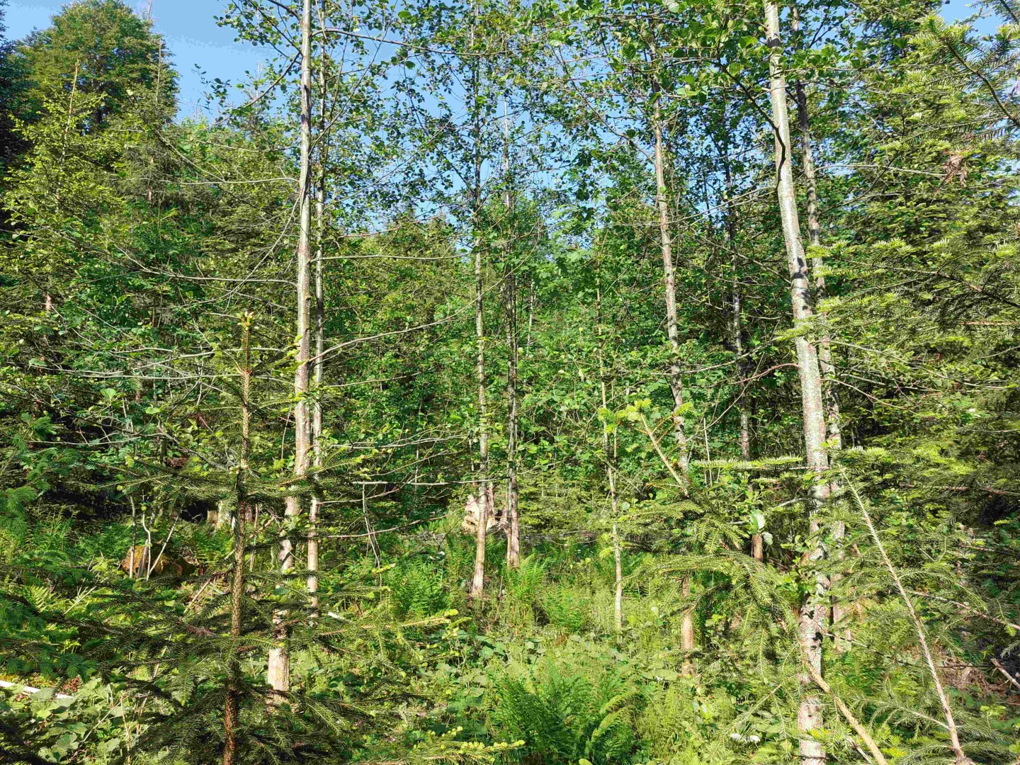 In der der Naturverjüngung kommen folgende Pflanzen: Fi und Buche kommen gut, BAh, Dg und Ta haben es schwer ohne Verbissschutz, die geschützten kommen aber gut. Bei der Ta ist auch schon bei den jungen Pflanzen Krebs vorhanden. Die Bi und Wei in der NV wurden wahrscheinlich im Zuge der Holzerei auf den Stock gesetzt.