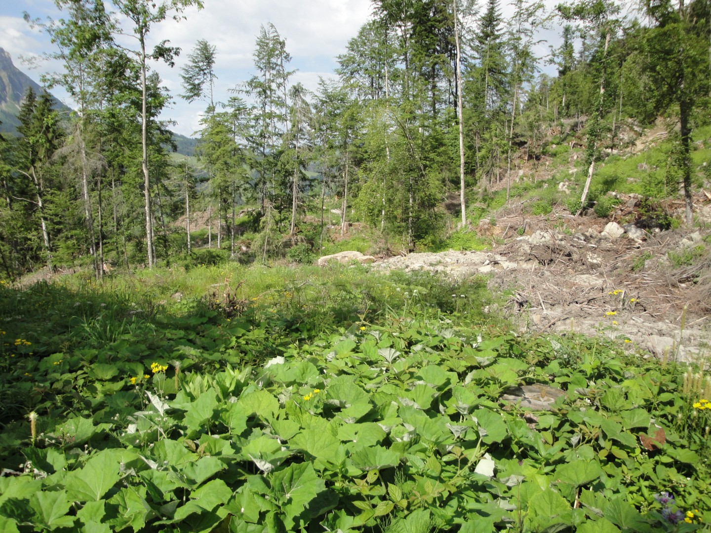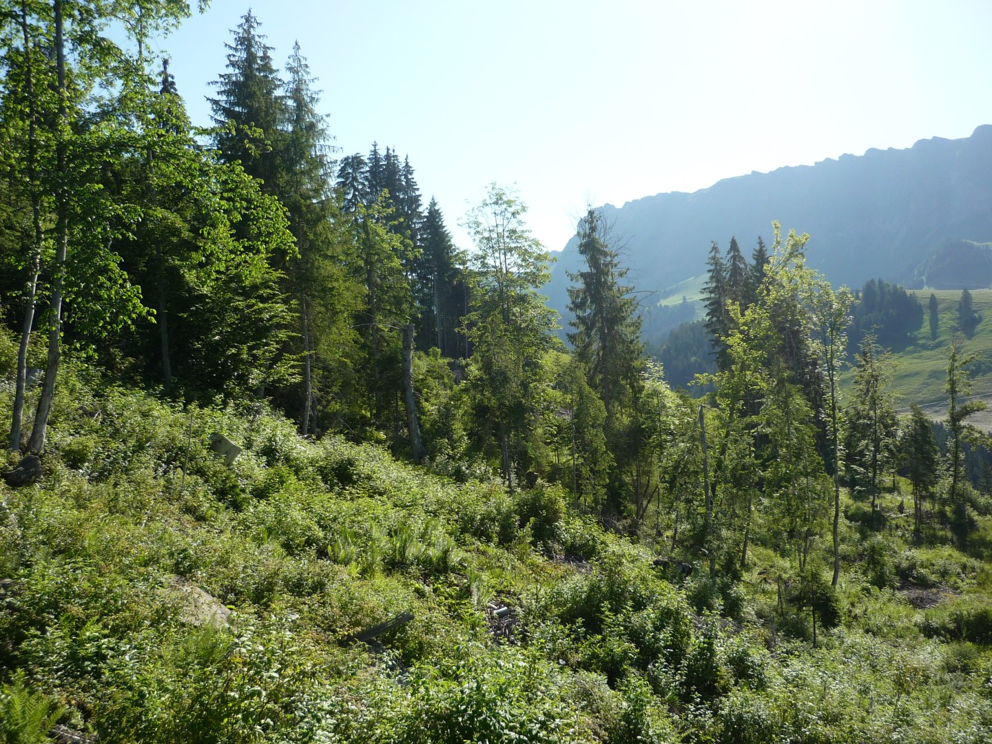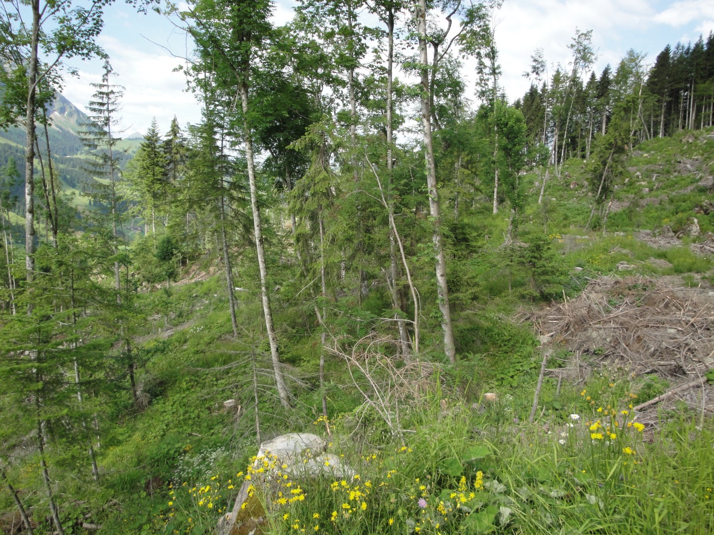 Die Tanne hat keine Chance aufzuwachsen. Einerseits aufgrund des hohen Wilddrucks und andererseits wegen beschränktem Samenangebot. Dafür etabliert sich eine schöne Laubholzverjüngung (Dickung bis Stangenholz) mit hauptsächlich Bergahorn aber auch ein paar Linden, Ulmen und Kirschbäumen.