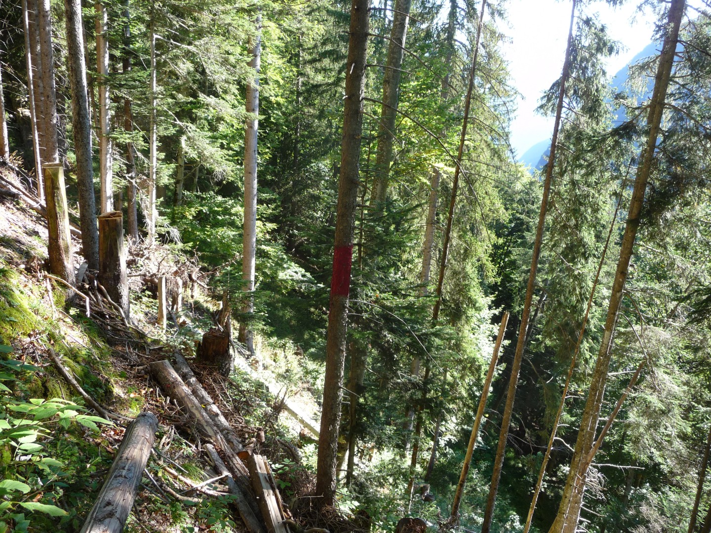 im kleineren Lawinenzug einzelne Bäume schräg zur Falllinie liegenlassen und evtl. sichern im grösseren Lawinenzug aus Sicherheitsgründen nicht